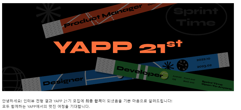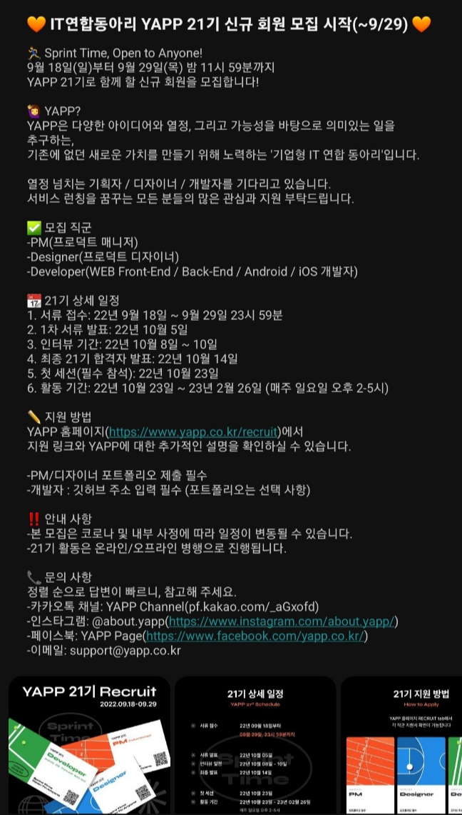 이번에 기업형 IT 연합 동아리 YAPP 21기에 백엔드 파트로 합류하게 되었다. 지원과정부터 앞으로 포부를 작성해볼까 한다. 백엔드 파트 기준으로 설명하자면 YAPP는 클라이언트 개발자, 기획, 디자인분들과 함께 6개월 동안 프로젝트를 진행한다. 또한 원하는 경우 팀 내 세미나와 스터디를 진행할 수 있다. 주로 ZEP이라는 메타버스 플랫폼과 디스코드, 오프라인을 통해 소통하는 분위기다. YAPP 공식 홈페이지에 적혀있는 YAPP의 풀이는 아래 인용과 같다. 'Your ㅡ Action, Passion, Potential' 도 중요한 키워드다.