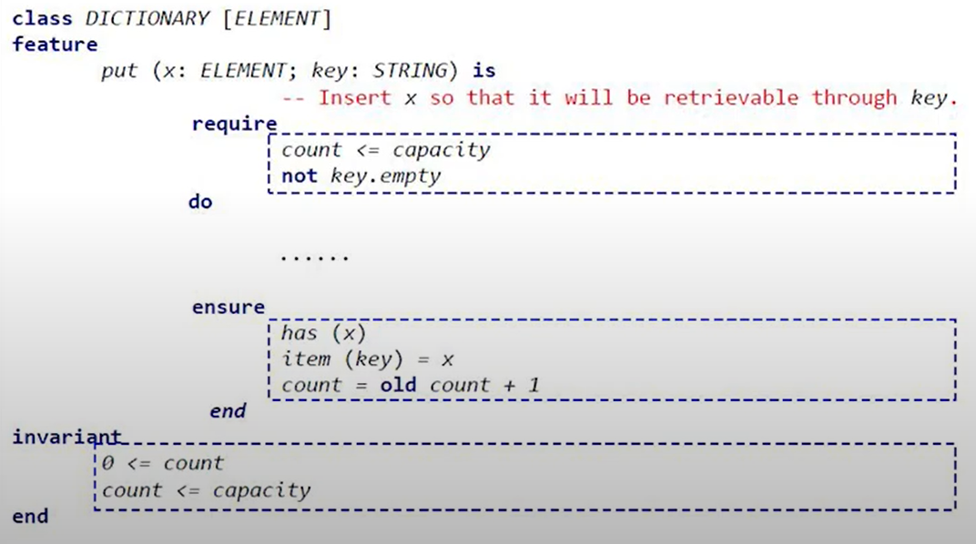 - 형식적 규약 외에 사전 조건(require)과 사후 조건(ensure)과 유지 조건(불변식, invariant)을 포함한다.